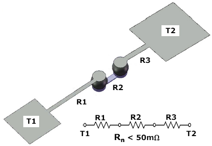 Using forensic analysis and experimentation, researchers can make improvements in the assembly process. Application engineers at TopLine are ready to assist with helping you to select the correct daisy chain for the job.Simplified Daisy Chain CircuitThe sum total resistance of a 2-port Daisy Chain is typically ≤ 50mΩ measured between test points T1 and T2. The actual amount of resistance is dependent on the length of the circuitry as well as the resistivity of materials such as Cu (copper), Au (gold), Ag (silver), Al (aluminum), Solder (SAC or SnPb), etc.