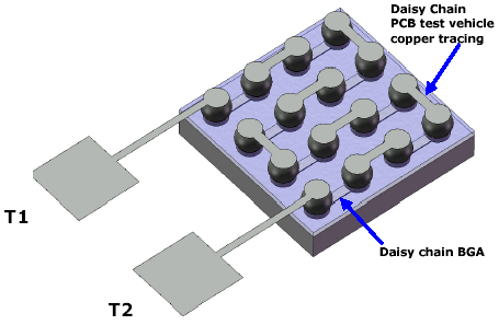 Research starts by mounting Daisy Chain devices onto a test vehicle board with complimentary daisy chain circuitry. This combination creates a short circuit with near zero ohms resistance measured at test points on the test vehicle board. The test vehicle board is subjected to harsh environmental conditions, such as dropping, vibrating, freezing and heating until a connection breaks.